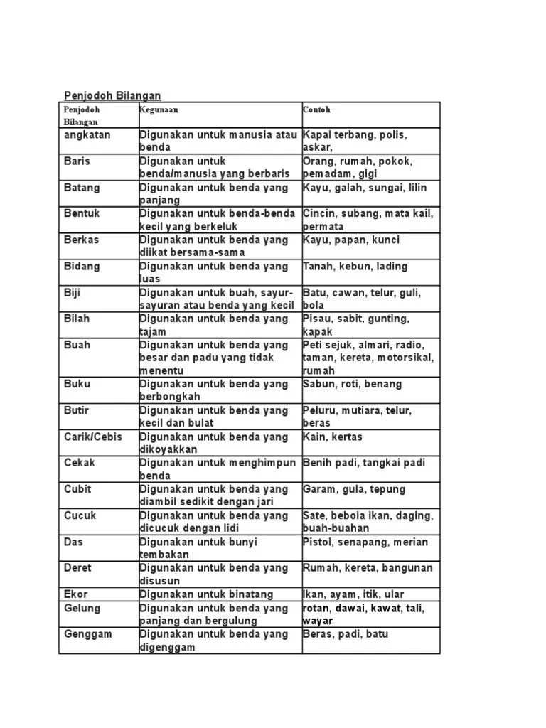 Penjodoh bilangan tidak perlu digunakan untuk membilang kata. Contoh angkatan untuk sekumpulan manusia atau benda. Dengan lidi das untuk bunyi letupan atau tembakan meriam, pistol, senapang deret untuk benda. Pak tamin menggalas serawan jala menuju ke tebing sungai. Digunakan untuk benda yang besar dan padu yang tidak menentu. Penjodoh bilangan digunakan sebelum sesuatu kata atau nama yang. Pasang untuk benda dan manusia yang berpasangan .